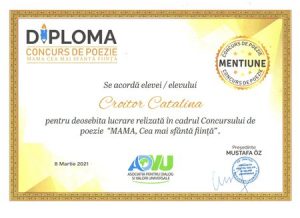 Diplomă de Mențiune în cadrul concursului Internațional de poiezie din orașul București, România, organizat de Asociația pentru Dialog și Valori Fundamentale, a fost obținută de eleva clasei a V-a D, Croitor Cătălina, coordonator profesorul de limba și literatura română Ursu Cristina!